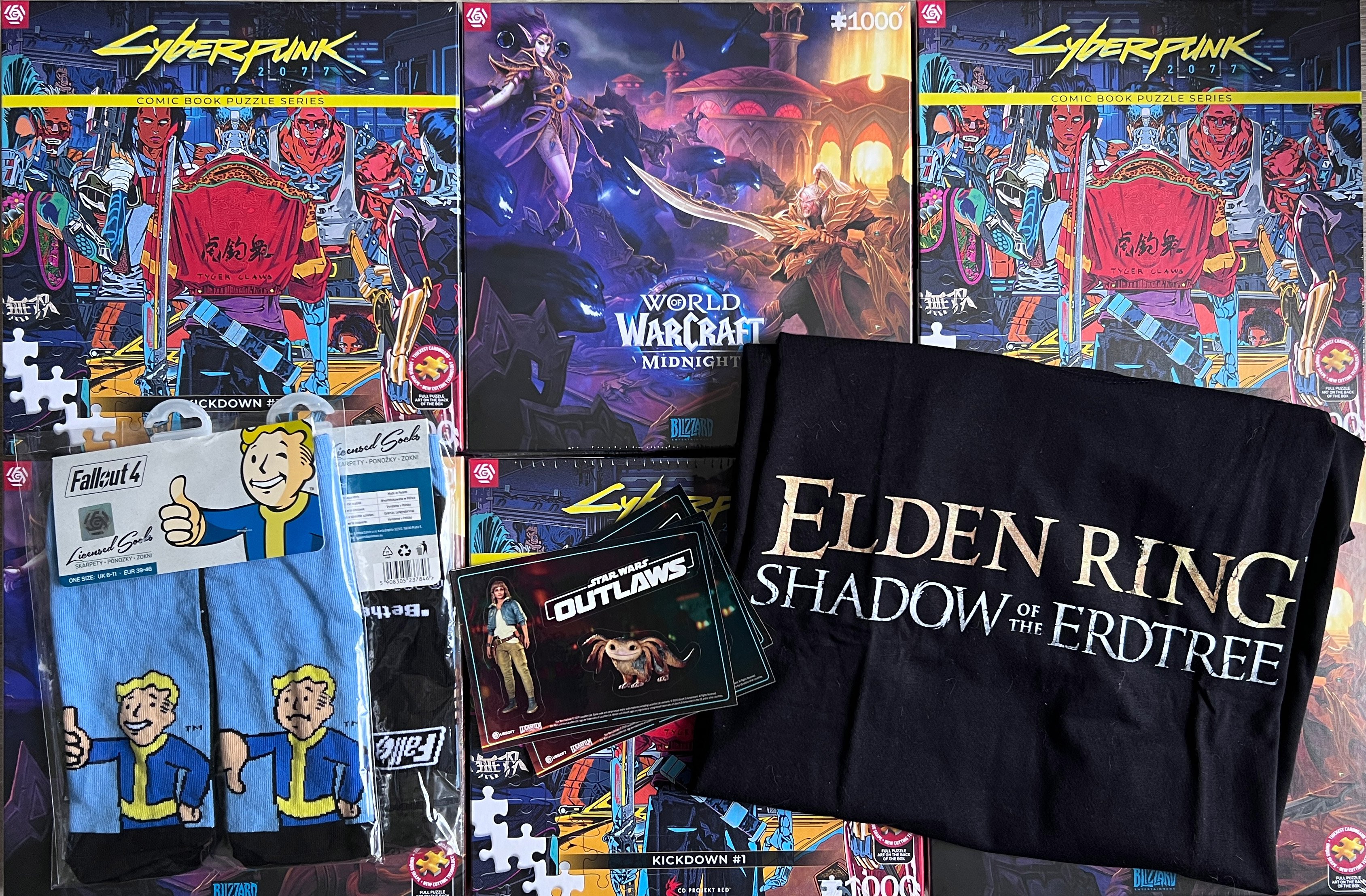 Czas na marcowy Extreme Box - konkurs we wtorek (17.03) o 20:00. W puli: puzzle Cyberpunk puzzle World of Warcraft koszulka Elden Ring skarpetki Fallout naklejka Star Wars Outlaws