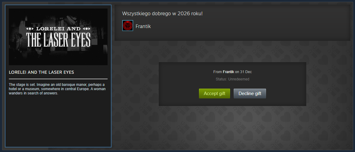 No i ja oberwałem, dziękuję bardzo Velsu i Grabek za gierki (no i faktycznie wczoraj Steam nie działał xd) Mój plan na przyszły rok jest żeby ogarnąć i skończyć jakieś prezenty z poprzednich lat - jak ostatnio liczyłem zostało mi jeszcze jakieś 100 gier xd Raczej wszystkich nie skończę, ale jestem ciekaw ile się uda