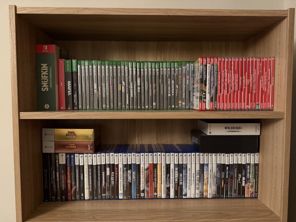 Ja tam nigdy potężnej ilości nie miałem, często rotują te pudełka. Xbox już rzadko wpada więc siłą rzeczy PS5 przybywa. Ale w końcu małej nie mam na pokoju, mogłem wyjąć z szafki z gaciami. Switchowe są w 2 rzędach.