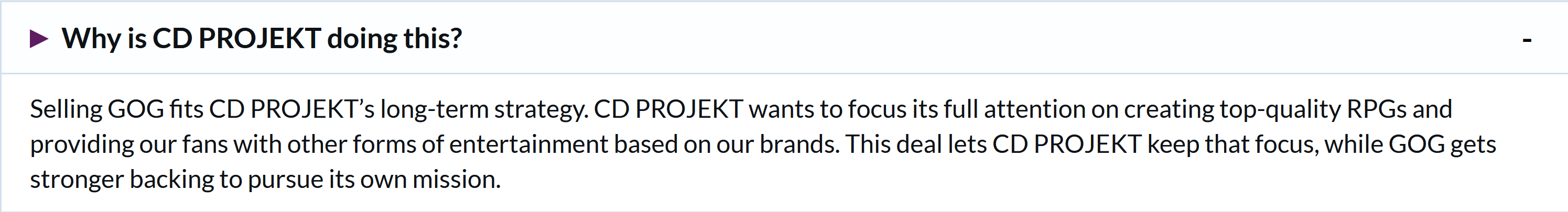Sam nie wiem, co o tym myśleć... Wydaje mi się, że szansa na sprzedaż GOG-a jakiemuś zagranicznemu podmiotowi przez jednego człowieka jest ciut większa, niż to, że CD PROJEKT wyrazi zgodę, bo wtedy decyzja musiałaby być zaakceptowana przez większą liczbę osób. Mam nadzieję, że panu Kicińskiemu nic nie odbije, że nie wpadnie w jakieś długi (inwestycje), albo nie odwidzi mu się "zabawka". A jeśli tak się stanie, to w ostateczności, kiedyś tam, sklep wróci do CDP (jeśli samo CDP nie zostanie wcześniej sprzedane xd).- Kącik bokserski