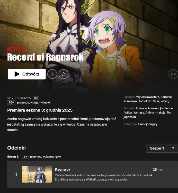 NETFLIX ma najbogatszą (hmmm... wszystko raczej na to wskazuje!) ofertę seriali anime z wszystkich platform streamingowych jakie były, są i będą...ever! xD. Jest tego ,,od za******a" i jeszcze więcej, a ostatnio kusić mnie zaczyna mocniej niż zwykle... Record of Ragnarok. Zwiastun, streszczenia pierwszych odcinków i plotu fabuły s01, jakoś mnie nie napawają mega-optymizmem. No ale... ten serial coś w sobie jednak ma, co sprawia, że przeciąga mnie na jego stronę... Ktoś oglądał? Polecanko czy nie? Łej. Piąty sezon ,,ST", mega rozbudowane ,,lore", w ogóle całe Uniwersum. A Ja? Stanąłem na finale serii pierwszej i jakoś mnie nie ,,hypuje" do kolejnych cykli. Nie wiem czy ,,Wieśka" nie zacząć oglądać od początku, bo w ogóle i tu mam zaległości. Chyba ,,Wiesiek" lepiej siądzie na ten moment. ST? Za kilka miechów raczej tak.