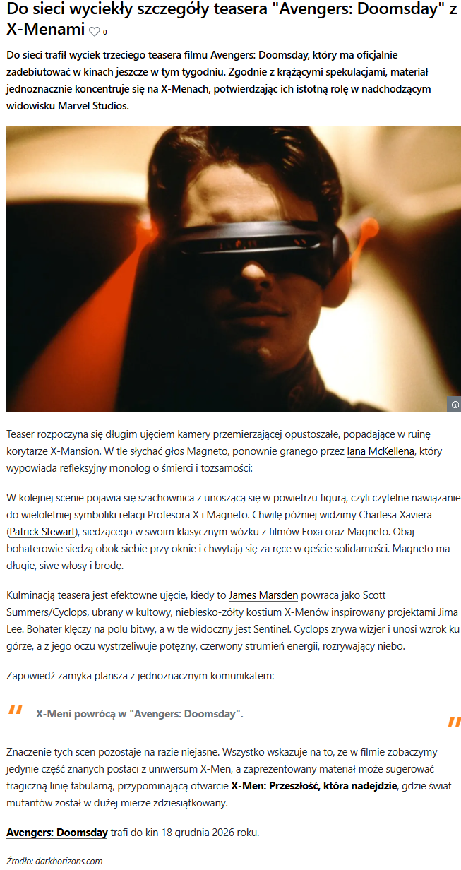 Co do ,,przecieków" i ich nie czytania w kwestii tego, co ,,tam się powydarza Łej Panie" w ,,Doomsday" i Spider-Manie z Hollandem, czwartym z serii... zwyczajnie nie mam ochoty ich czytać. Tak do 50-60% się nie sprawdza; wytrzymam zapewne do lutego, do fin. Super Bowl 2026, i wtedy zacznę nadrabiać przecieki, no i możliwe analizy zwiastunów. Po ,,Brand New Day", oczekuję, żeby było bardziej kameralnie i jakby swojsko, coś a'la Spider-Many Raimiego, ale z dodatkiem mega dynamiki, którą pokazał nam Destin Daniel Cretton w ,,Schang-Chi" z MCU. Obyyyy oba filmy miały pierdolnięcie dla całej fabuły nowych Faz MCU!
