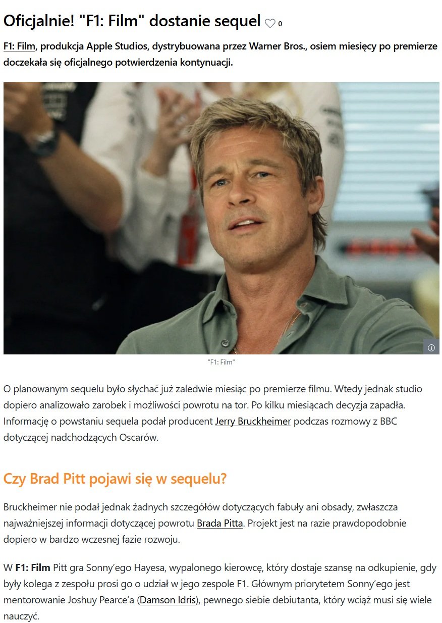 Ostatnio coś Pan Cena... jest ,,rozchwytywany" jako ,,ten idealny" (faktycznie, coś w tym jest, bo John ma specyficzny styl aktorski, jak i charyzmę - idealny do czegoś komediowego jak i bardziej poważnego, a czasami i do filmu czy serialu z miksem gatunkowym w tle xD) kandydat na akcyjniako-komedio-generyki streamingowe. Raz Netflix, raz Prime, Apple, teraz... znowu Netflix... xD. Chociaż sam opis filmu, obsada aktorska oprócz Ceny... no, nie powiem, wygląda to całkiem całkiem. Czyżby wyszło z tego coś dużo, dużo więcej niż typowo przeciętnie? Czas pokaże. Tak, w sequelu ,,F1", któremu nie daję większych szans z zakresu fabuły etc., Bratt będzie zapewne jakimś mentorem nadchodzącej gwiazdy F1, która szturmem wdarła się do tego środowiska - powtórka z ,,Gran Turismo"?