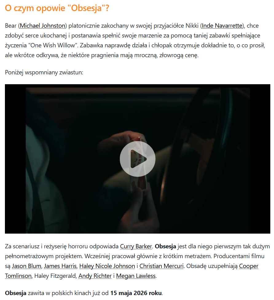 ... I podoba mi się ,,słowo wstępne" do ,,Obsesji": ,,uważaj o czym marzysz". I nie ukrywam, że na tego typu film... czekam dość mocno! Ciekawie budowany klimat, napięcie; a sama fabuła, aktorzy (ich dobór do ról) - tu może być bardzo dobrze. Tylko czekać!!!