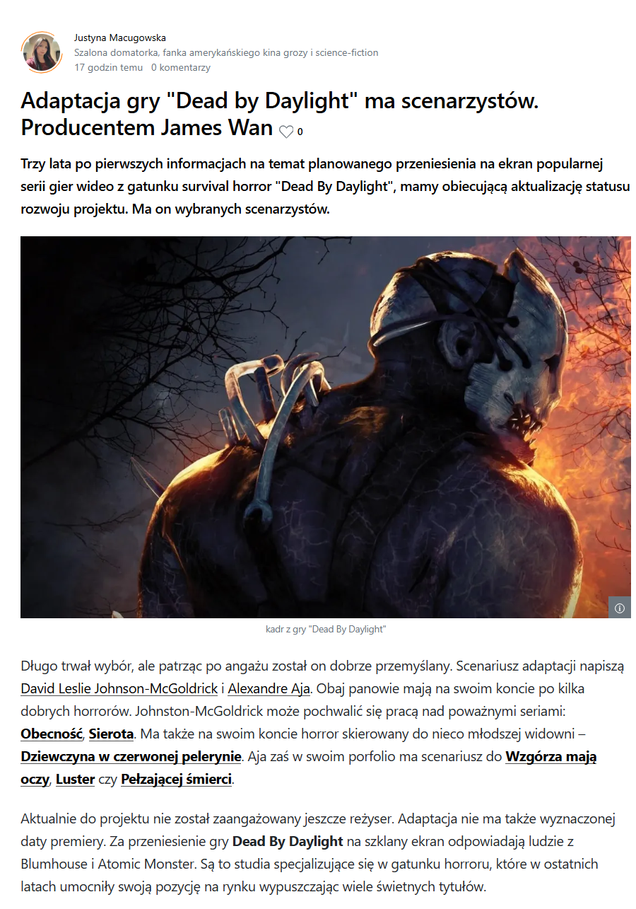 Z serwisu FDB.PL: Blumhouse i Atomic Monster... no i producentem wykonawczym niezrównany maestro makabreski i ogólnie pojętego thriller-horroru, James Wan?! I to adaptacji ,,Dead by Daylight"? Ależ to będzie! Oł maaaan! Tego rodzaju wiadomości horrorkowe to ja rozumiem!