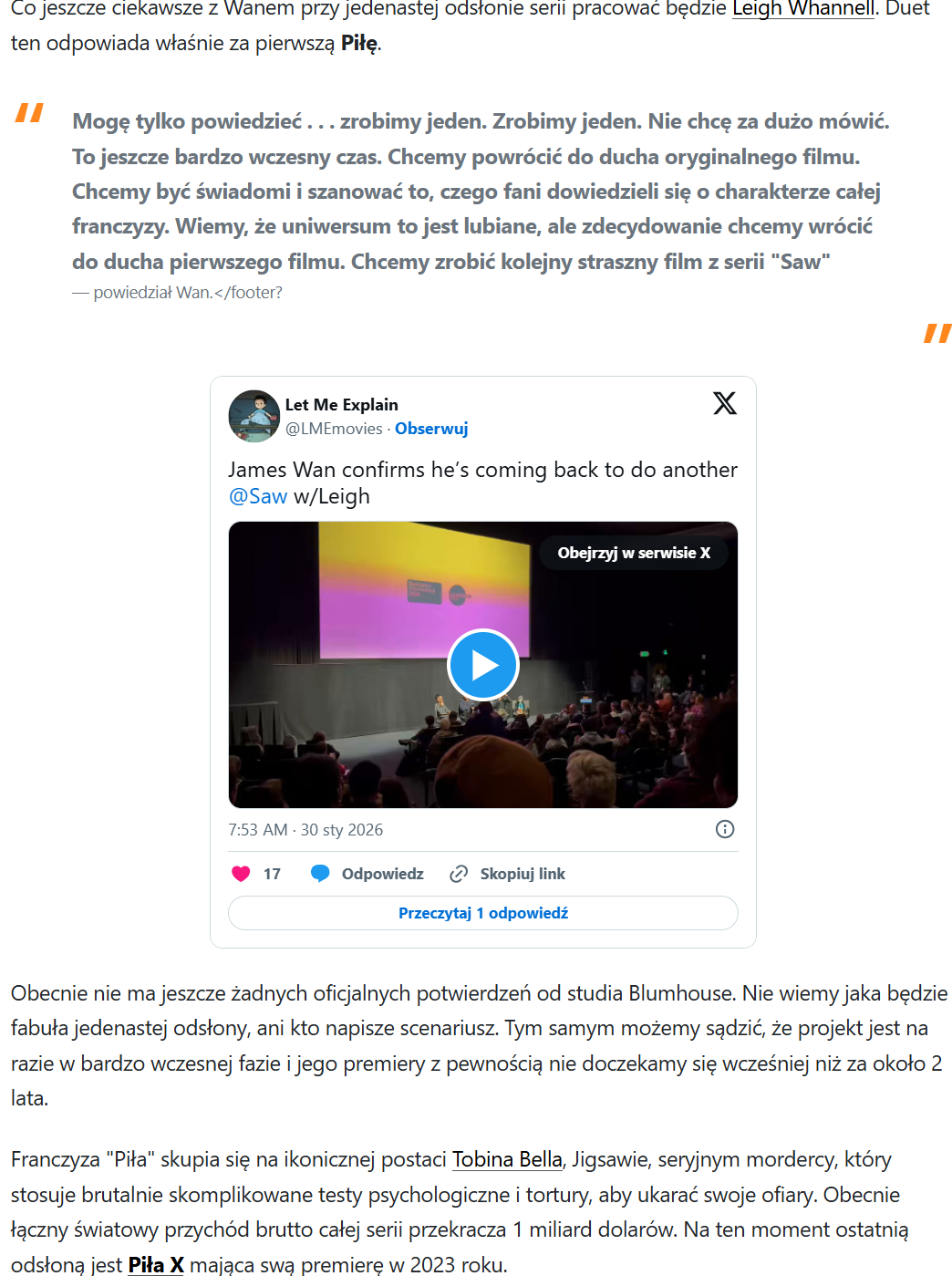 I... jestem za Problem w tym, czy istniałoby coś, co ma motywować scenarzystów i Wana do sięgnięcia jakichś zakamarków wyobraźni horrorkowej, aby (moim zdaniem) prawie że zużyte materiałowo i tematycznie Uniwersum Saw dalej i dalej rozwijać. Tak, ,,Piła XI", czy jakkolwiek 11-sty projekt z serii będzie się nazywał ma szansę na sukces, ale jaka fabuła ma to gwarantować? Może rozszerzanie Uniwersum od strony wczesnych Prequeli?