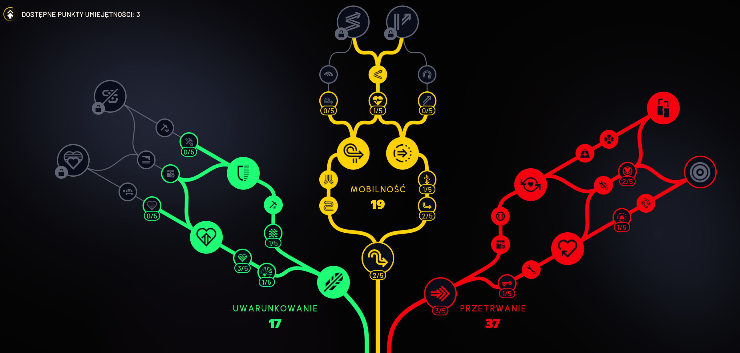 Wyklikałem to drzewko do takiego stadium, zostały mi 3 pkt gdyby coś zmienili. Jak ktoś zrobi lepsze pomiary 3 głębokich wdechów i wyjdzie to samo co kolesiowi którego wrzucaliśmy ostatnio, to może faktycznie lepiej te 2 pkt przenieść gdzieś indziej w tym czerwonym drzewku. Ew jak ktoś ma build pvp to może olać ostatnie dwa środkowe skille w czerwonym i wpakować bardziej w szybsze poruszanie z kucaniem/szybszą regenerację w kucu. Skill z zielonego z wagą broni przez pół nie jest mi potrzebny, bo od kiedy wymaksowałem ten z czerwonego do udźwigu to nie pamiętam żebym był kiedyś przeciążony. Pewnie się zdarzy jakaś pojedyncza sytuacja np przy runie na matriarchę/queen gdzie by trzeba było coś zrzucić. Ostatnio jak miałem pełny plecak i 2 rdzenie to nadal nie było z tym problemu. Na ten moment z zielonego skille meele są bardzo sytuacyjne, przydałyby mi się tylko w tych runach kiedy goniłem na golasa, ale radziłem sobie i bez nich. Jeden niewybrany skill z dołu(z dłuższym umieraniem) jest pokryty jak się używa augmenta survivor(a zwykle latam albo z nim albo z looting mk2), a ten finalny ponoć daje mały zastrzyk życia dopiero po 10 sekundach wiec bez buffa to jest mega sytuacyjny. Skille topowe (duże z góry) żółtego może i bym chciał mieć, ale ilu wipe by to wymagało żeby się tam doskrobać zostawiając nadal resztę w podobnym stylu? Do tego te niewybrane skille z żółtego na ten moment są trochę rozczarowujące z tego co w necie poszukałem. O ile nie będzie buffów/debuffów/naprawy częsci skilli to może z czasem dołożą np 4 drzewko i będzie coś ciekawiej, bo teraz to nie widzę żebym przez przynajmniej 3 wipe poczuł różnicę wartą zachodu. Ze skrzynką zresztą podobnie ;) 12 miejsca to homeopatyczna wartość, po 3-4 to w końcu rośnie do czegoś co może ma znaczenie.