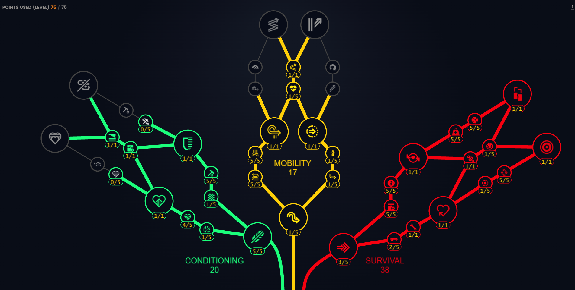 Faktycznie musiałem coś skopać, bo emulator z metaforge źle łapie przerzucanie skilli. Ja mam w grze tak: Na pewno chcę te dwa duże zielone wziąć. Fight or flight(Walka lub ucieczka) z zielonego drzewka też jest dobre więc jakoś dopakuje je i "Obciążenie mi nie straszne". Przy czym nigdy nie biegałem z ciężką zbroją, więc mi to jakoś mocno nie przeszkadzało spowolnienie - w końcu mam augment Survivor więc mogę coś więcej biegać z niebieską, którą brałem bardzo okazjonalnie. Paker/Loaded Arms z zielonego moim zdaniem wcale nie jest aż tak zarąbisty, bo zwykle chodzę lekkimi brońmi, a dobry plecak + szerokie bary(broad shoulders czyli +10kg udźwigu) załatwia sprawę tak że bardzo rzadko mi się zdarza żebym był przeciążony. W czerwonym drzewku jest bardzo dużo przydatnych skilli. Niektórzy narzekają że ciche przeszukiwane nadal słychać - tak to prawda, ale dla mnie ten skill bardzo dobrze działa z perspektywy gracza, w sensie jak ktoś nie podchodzi na kuckach to jestem nadal w stanie go usłyszeć przy wymaksowanym, jestem dużo bardziej świadomy otoczenia. A jak idzie o to ciche bridgowanie(gentle pressure/delikatny nacisk) z zielonego drzewka to widziałęm tylko jeden filmik: Imho nie odpowiada on do końca na pytanie, bo chciałbym wiedzieć w jakiej odległości do się niesie jak coś otwierasz w środku budynku, ale uznaję że to akurat i tak jest dość głośne + mam większą wiedzę o otoczeniu niż jak przeszukuję. Tak czy owak wygląda to na stosunkowo słaby skill na ten moment. Ten ostatni po prawej(Saper - rozbajanie pułapek przeciwników) kupię jak uznam że faktycznie to naprawili, bo w tej chwili miny się ponoć aktywują z większej odległości niż jesteś w stanie podejść żeby tego użyć. Juz pomijając to że ogarnięty gracz ustawia pułapki tak żeby się ich nie dało ominąć. A ten skill żółty po środku u góry IMHO bardzo fajny jest :).