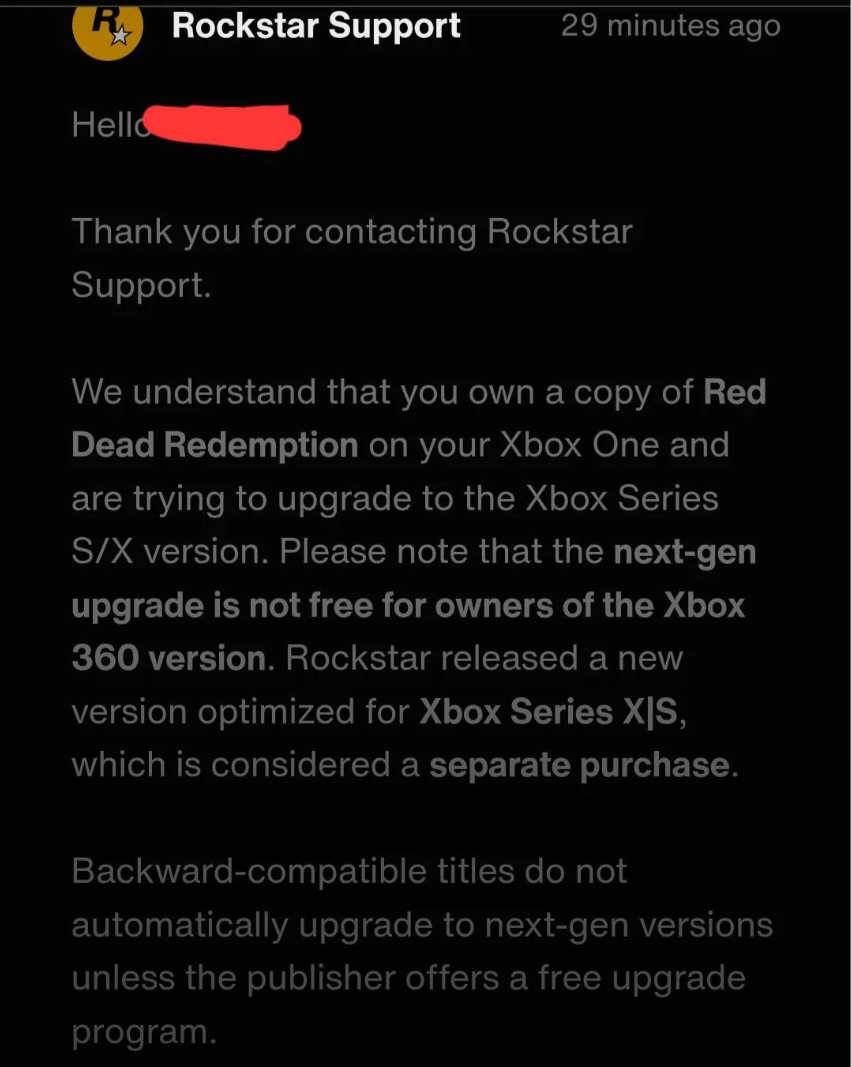 Może jeszcze raz, głośno i wyraźnie, żeby wybrzmiało: po chuj wrzucaliby na oficjalną stronę dokładne instrukcje jak zrobić darmowy upgrejd skoro nie ma darmowego upgrejdu? Ktoś tam nawalił, może w Rockstar, może w MS. https://support.rockstargames.com/articles/4N3KZjflZeI02AKQjVKdGQ/how-to-upgrade-my-copy-of-red-dead-redemption-from-xbox-one-to-xbox-series-x